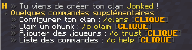 Pour commencer avec les **clans**, tu dois effectuer la commande `/clan create <nom du clan>`, ce qui te permettra de créer ton clan. Cette commande va **claim** le **chunk** où tu te trouve. C'est-à-dire que personne à part toi ne pourras construire, casser de blocs, ouvrir de coffres, etc.&#x20;